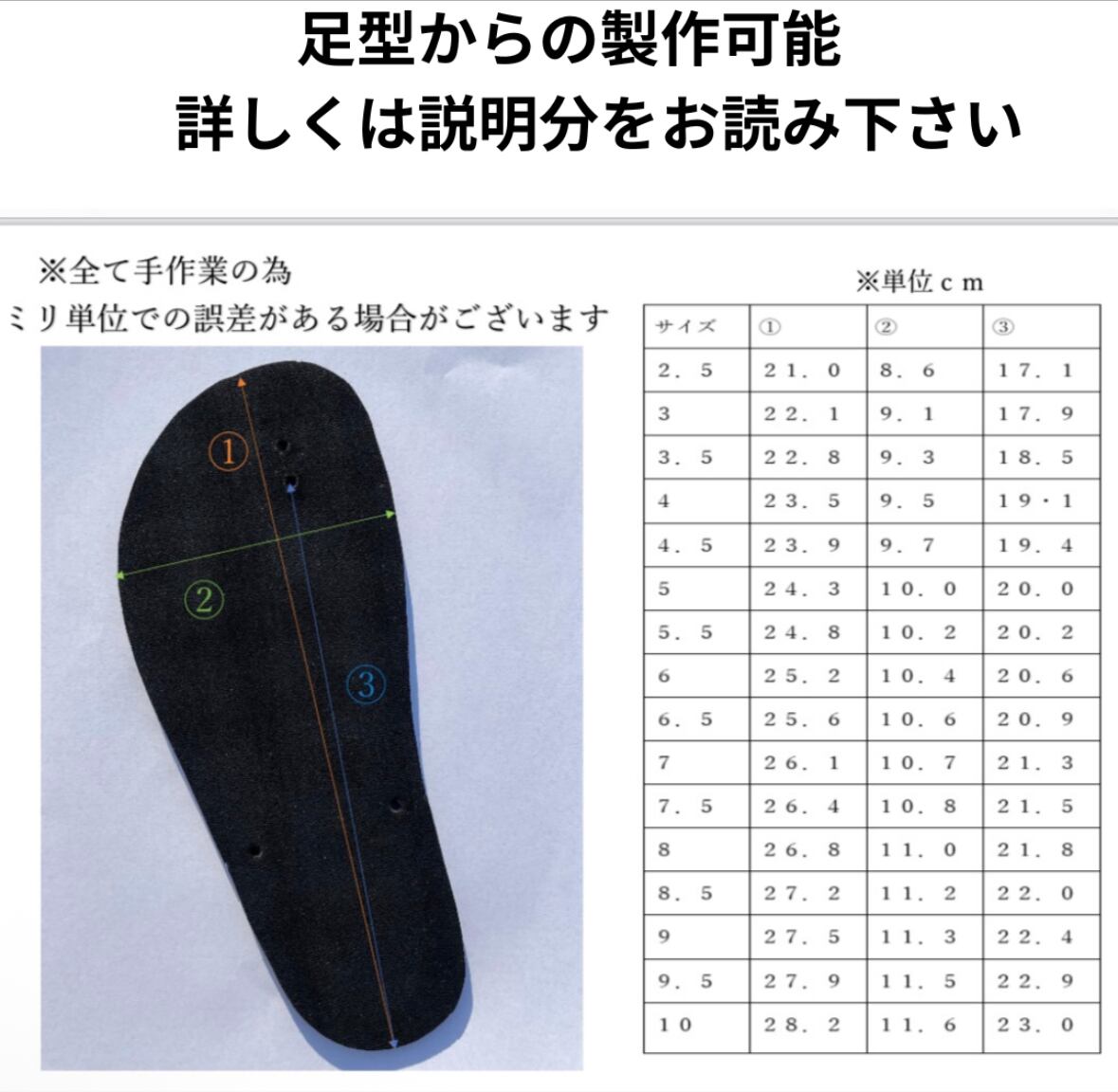 足型から製作:+¥2,000(別途『ワラーチ完成品 足型製作』購入)紙トレースor写真送信でミリ単位で製作!左右差大・既製品が合わない方に最適。世界に一つの一足をプロが製作します。